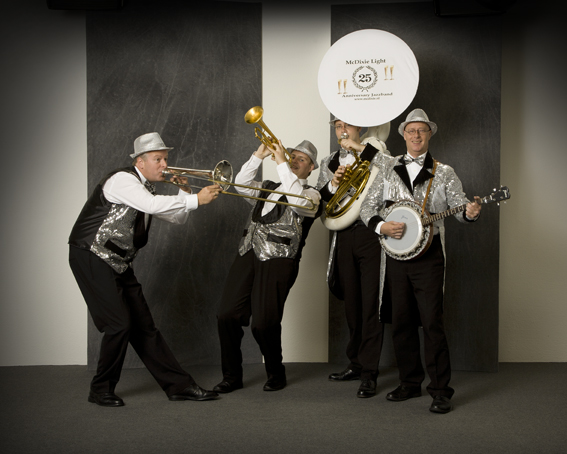 Deze Jubileum Dixieland Jazzband is speciaal gekleed voor het vieren van een 25 jarig “zilveren” jubileum. Dit looporkest is geschikt voor het ontvangen van uw gasten bij aanvang van het feest en voor gezellige sfeermuziek tijdens het borrelen! In overleg kunnen zij in een speciaal voor u gemaakt arrangement uw favoriete song spelen in Dixieland stijl. Zij zijn tevens te boeken als Gouden Jubileum Orkest.