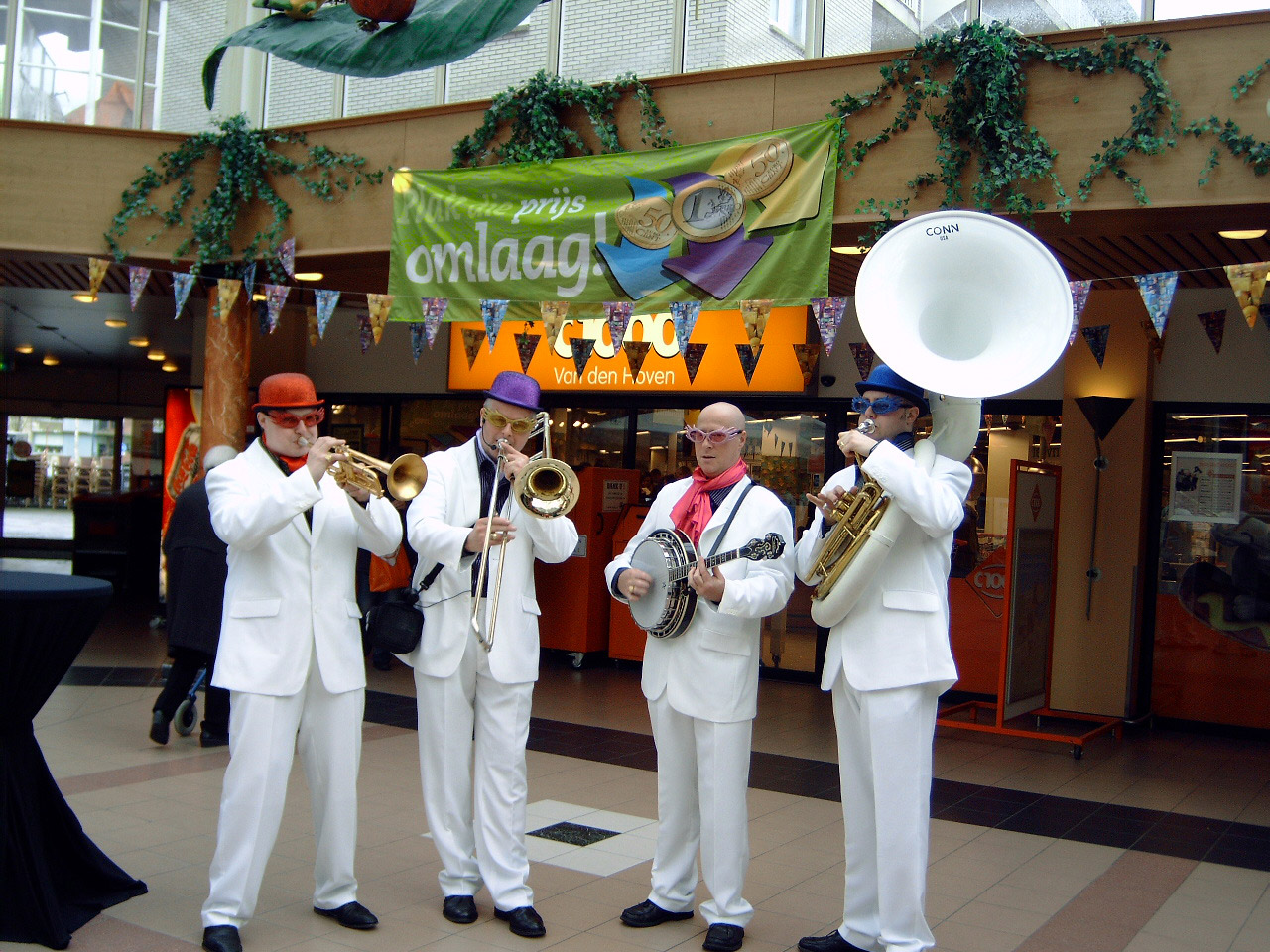 Deze jazzmannen in witte kostuums gaan voor een glitter & glamour lifestyle. Uitgedost met opvallende zonnebrillen, glitterhoeden en vette gouden sieraden komen zij op uw party de boel op z’n kop zetten. Jazzy, dixie, sing-a-long, het swingt als een trein. Een beetje gek, maar het valt wel op!